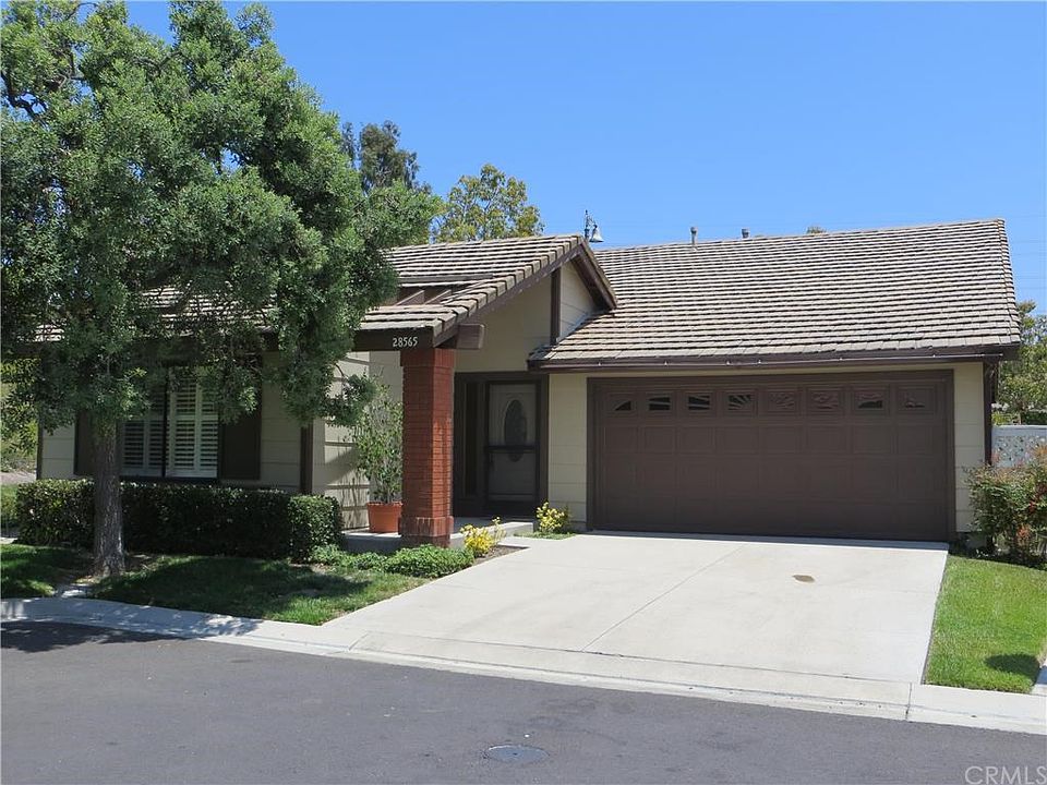 Light and bright freshly painted interior cul de sac location of this Rosa floor plan in the beautiful Casta del Sol +55 active community. The wide tile entry leads to a large open living room and dining room with a brick fireplace. Two large sliders lead to covered patios with greenbelt views. The bright kitchen features lots of white wood cabinets, a full pantry, window to side patio, tile counters and ceramic tile floor, and a cozy breakfast nook. The refrigerator, gas range and dishwasher make it complete.The large master suite with plantation shutters has a greenbelt view. The master bath has a separate vanity from the large shower room, and a walk in closet. The second bedroom has plantation shutters and a large slider closet. The den, located off of the living room could easily be converted to a nice 3rd bedroom. The hall bath features a large stall shower. The oversized direct access garage has built in cabinetry, and washer and dryer hookups. Casta del Sol is a lifestyle community with pools, gym, a recreation center with many activities, community gardens, and miles of greenbelts and walking paths. Owning a home in Casta del Sol includes a membership to Lake Mission Viejo with activities of all ages. HOA maintains exterior landscaping, paint