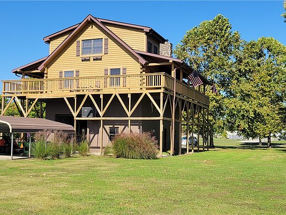 On the main level is a open concept living , kitchen has granite counter tops , views from every window , beautiful stone fireplace place in the living room . the loft area is consider the master bedroom with a full bathroom with a open view to the living room . On the main floor there is 2 bedrooms , the back bedroom has French doors to the porch. Also on the main floor is a full bath and laundry area. On the outside is 2 porches on the front and back with swings , on the sides is 2 deck areas . This property