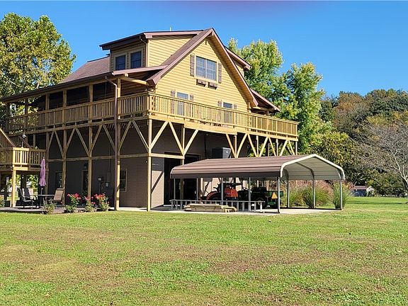 Beautilful log home built in 1995 , offers 3 bedrooms 3 full bathrooms .From the above ground basement/garage, offers parking for 2 cars , garage doors on both ends . Also the basement has a gas fireplace , bar area , full bathroom , utility sink , and a work bench . Outside the basement is a carport , and a patio area.