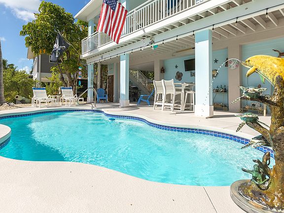 Welcome to this Concrete Block home that Boasts of Comfort in the desirable Jolly Roger Estates with quick Ocean Access minutes to Open Water, no bridges, this 2 Bedroom 2 Bath Stunningly Updated Home, 60 ft concrete dock with 13lb Boat Lift, electric & water & fish cleaning Table, Heated Pool, Large 2 Car Garage with plenty of space for toys, Impact windows and Sliders, this home comes complete ready to move in, walk into the beautiful living room with tile floors, hunter douglas electric shades, kitchen offers cortz countertops all stainless appliances, center island for the chef, Master Bedroom offers sliders that overlook the pool, Hunter Douglas darken shades and walk-in closet,upstairs balcony with outdoor dining that overlooks pool and dock, downstairs patio offers entertaining area at pool, RV hookup, on demand hot water, new metal roof being installed 12/2, some of the best fishing to be found, this home is a must see.Minutes to great Restaurants and shopping, Little Palm Island minutes away.