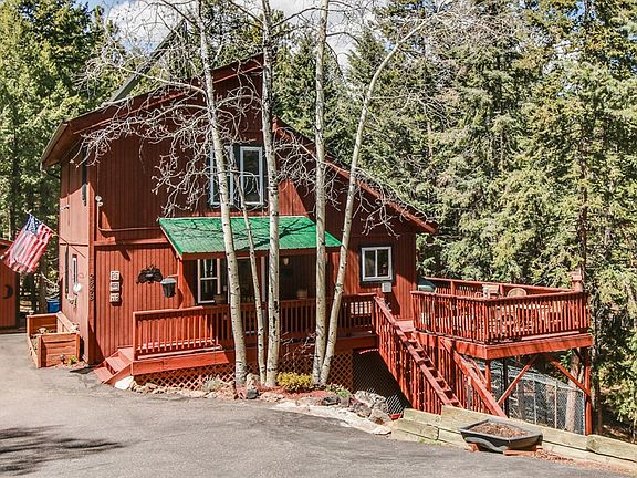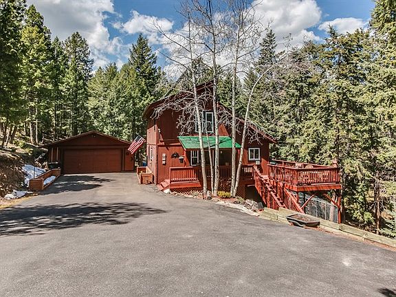 Charming home perfectly situated on 1.5 acre lot with two decks that overlook a private serene setting along a well-traveled Elk/Deer trail. The charm exudes from the quaint living room warmed by a pellet stove and hardwood floors all open to an updated kitchen. Corian counter, stainless steel appliances, tile backsplash and breakfast bar all vaulted and filled with natural light. All new windows and solar assisted water heater help on those energy bills. Main level bedroom and updated bathroom with granite and tile. Master bedroom on upper level with another updated 3/4 bathroom. Loft space perfect for a quiet reading nook. Lower level features a non-conforming bedroom and a media/office space and wood burning fireplace which opens to a sun room that reflects a picture perfect deck/tiered fenced backyard, dog run and a seasonal stream. Oversized two car garage that features a separate workshop area for all of your tools/building supplies. Extend your living space outdoors with a large wrap around deck perfect to enjoy those hummingbirds and Elk with your morning coffee. Located right off of paved and well maintained Cragmont Drive and easy 8 minute ride to downtown Evergreen or 10 minutes to Conifer.