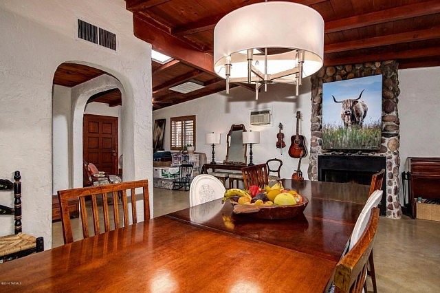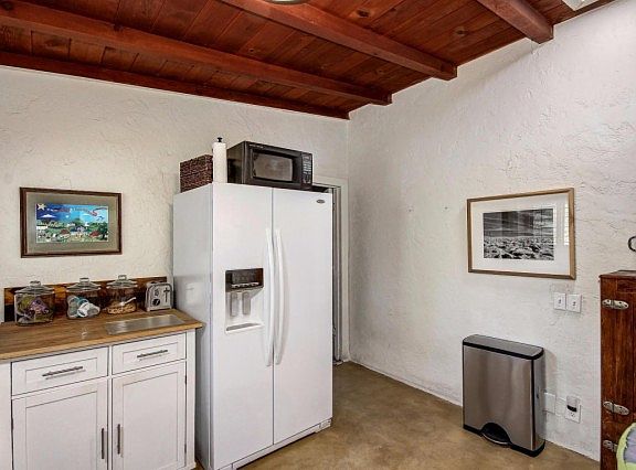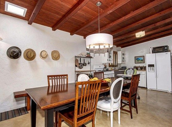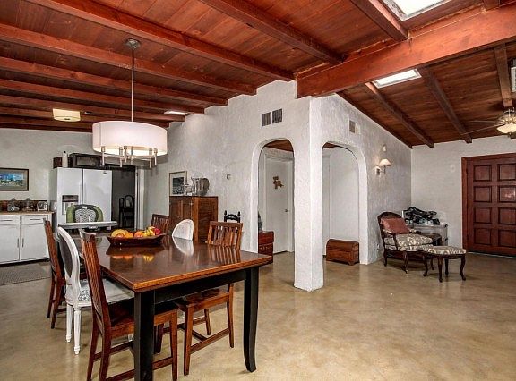Outstanding Home with lots of Charm and Character! Vaulted wood ceilings, polished/stained concrete floors t/o, crisp interior palette, upgraded lighting, ceiling fans, skylights, plantation shutters, and move-in ready. Stone fireplace and reading nook hideaway area. Retro kitchen features white appliances and white wood cabinetry with stylish hardware. Grand master retreat with private vintage en suite. Huge backyard with natural desert, storage shed, covered patio, and Mountain Views. Room for a pool!