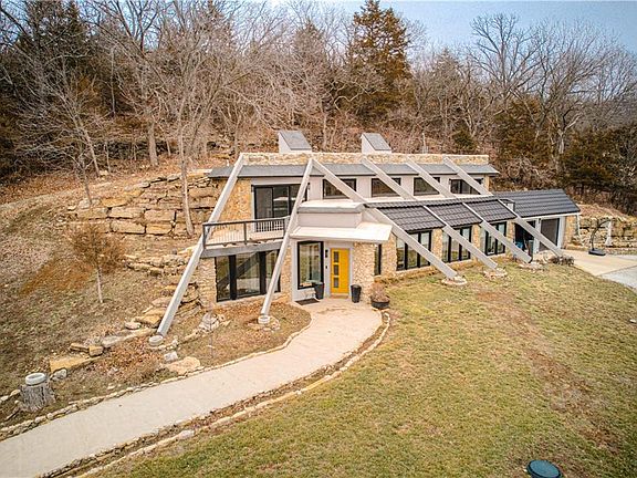 Energy efficient earth contact home nestled on 6.5 acres of land. Serene views of the 3.5 acre fully stocked pond. Brand new hardwoods, windows and sewer line. Completely renovated, nothing to do but move in and enjoy your new relaxing setting! Light and bright throughout. Main level primary suite, large main level laundry with pantry and sink. Loft with wet bar, 2 bedrooms up with private balconies and walk-in closets. Additional outbuilding or 2 car garage. Covered picnic area and dock shared by 3 homeowners. Above ground pool can be removed by the homeowner if the Buyer is not interested in it.