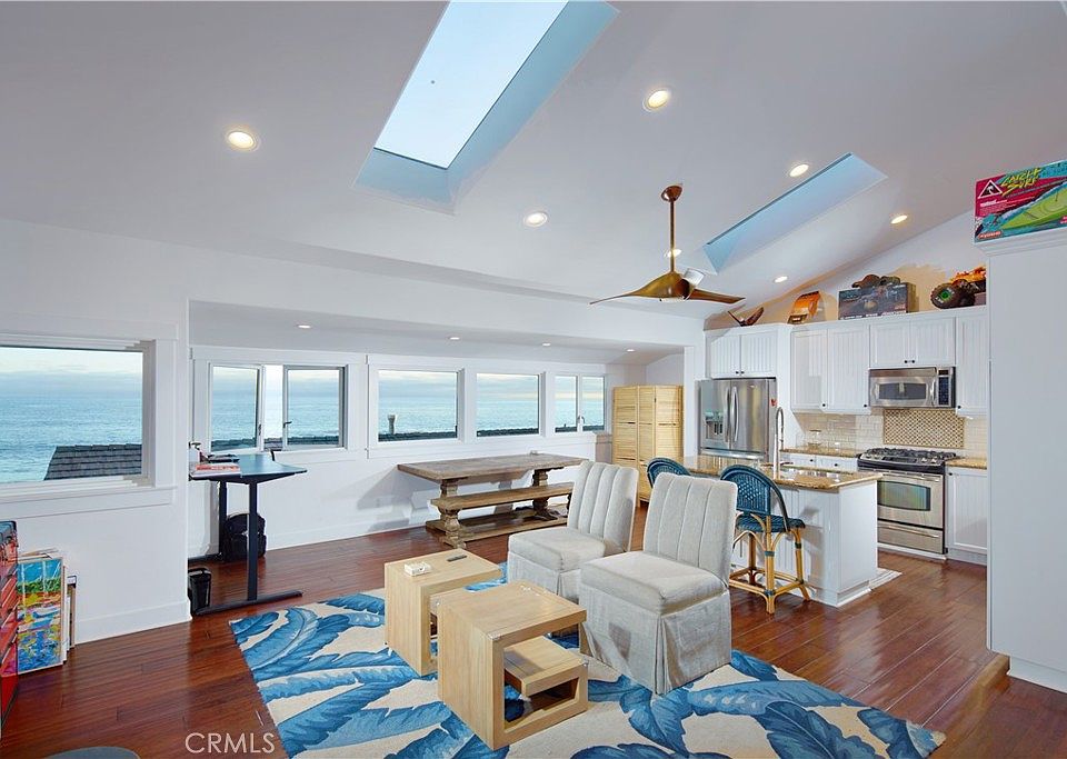 Perched above the sands of Victoria Beach in Laguna Beach, this charming unit offers a serene coastal retreat within an extraordinary multi-residence compound. Situated on an expansive nearly 10,000-square-foot lot with a rare 60 feet of beach frontage, this residence, located above the main home, features 2 bedrooms and 2 bathrooms, thoughtfully designed to maximize comfort and capture breathtaking ocean views. The open-concept living area and kitchen create a seamless flow, enhanced by sweeping ocean vistas that bring the beauty of the coast indoors. The kitchen is well-appointed with a central island, breakfast bar, refrigerator, and stove, making it ideal for casual meals or entertaining. The primary bedroom boasts a private ensuite bathroom and its own separate access for added privacy and convenience. The second bedroom provides a cozy retreat with convenient access to the home's main living spaces. Outdoor living is further elevated by a spacious, private terraced patio that separates this residence from the sand-level main home. Experience the best of coastal living in this thoughtfully designed unit, where panoramic views and luxurious amenities come together to create a truly one-of-a-kind beachside lifestyle.