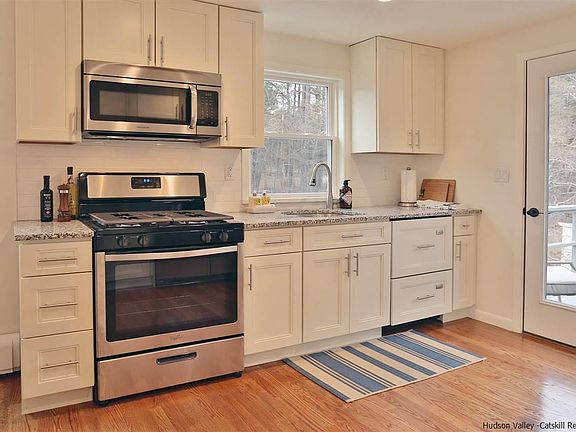 Located minutes from Stone Ridge on a quiet country road, this 4 bedroom 2 bath home has been thoughtfully renovated. An open and bright kitchen with stainless appliances. The adjoining deck overlooks the property and is perfect for entertaining. The large ground floor suite has its own private entrance. Many interior features include beautiful hardwood floors, granite countertops, new windows and doors, and a new roof. You will have nothing to do but enjoy the fine craftsmanship and premium finishes of this move-in ready home. The property has great gardening potential. A short drive to the towns of Woodstock and Kingston, and less than 2 hours to NYC.