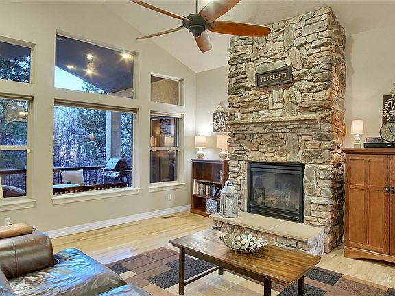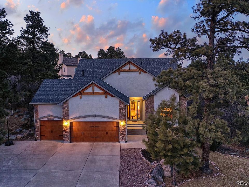 Stunning walkout rancher built in Spires of Broadmoor, nestled in the tall trees up against Cheyenne Mountain on a 1/3+ acre. Walk into your Dream home with open floor plan, 9ft+ vaulted ceilings, 8' Doors on the main level, gourmet kitchen with upgraded Arstokraft maple cabinets, top of line appliances including Jenn Air 5 burner gas cook top, large walk in pantry, hardwood floors, granite counters, large island. Open floor plan designed perfectly, snuggle up by the fireplace and enjoy the forest views through the oversized windows. Main level master walks out to covered rear trex deck, spa-like 5 piece bath with upgraded granite & travertine tile. Main level 3/4 bath adjoins office/bedroom enclosed with beautiful french doors. Downstairs enjoy walkout basement, 9' Ceilings 2nd stone gas fireplace in family room with ample space for games & plumbed for future wet bar. Walk out to private patio. 2 oversized bedrooms downstairs with walk-in closets and share the adjoining full bath.