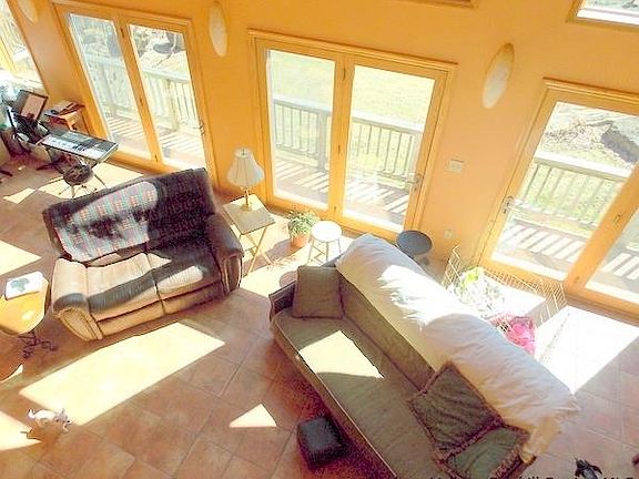 This rare find in historic Rosendale (the birthplace of cement) has so much to offer. The total privacy of this custom designed contemporary elevated up a beautiful winding drive awaits you. Built in 2004 this sun-filled, super-efficient, hypoallergenic, green home with a gorgeous glass wall facing south on all three levels was thoughtfully constructed. Passive solar means lower heating bills and the whole house fan makes the need for air conditioning rare. This open floor plan with vaulted ceiling has gourmet kitchen, dining, living room, bedroom, laundry and bath all on the first level. Upstairs has two bedrooms with custom shelved closets, a full bath with 2-headed shower and balcony overlooking the living room. There is also a north side screened in porch (very cool in summer) and a southern facing balcony which can easily be converted into a full deck. The entire home is wired for cable, tv and internet in every room.