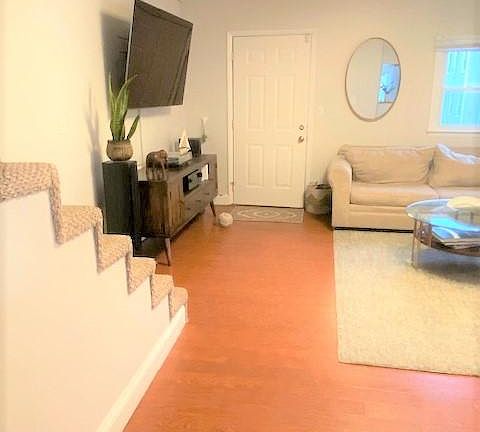 Spacious pet friendly 2 bedroom/1 bathroom townhouse with 2 tandem parking spots! The townhouse features hardwood floors, eat in kitchen, large living space, wet bar area, updated bathroom, large storage area in basement, laundry in unit, and private deck! Available 8/1/2020. Tenant to pay full fee.