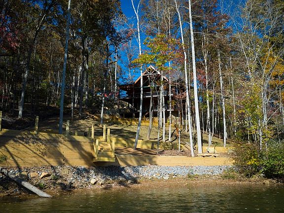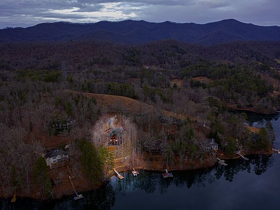 Designed to perfection and crafted to inspire, this custom lakefront home is stunning in every detail. Sweeping views of Lake Santeetlah and the Snowbird Mountains are on full display throughout the expansive 3,648 sq. ft. layout featuring 4 bedrooms and 3.5 bathrooms. Crafted for today's modern lifestyle, this home clad with pine logs and cedar trim was thoughtfully designed with an open floor plan featuring south facing windows to enjoy stunning water views. The cathedral ceiling soars with open trusses. There is a light filled dining area and adjoining great room with Jamestown stone gas fireplace and custom built-in for the electronics.
