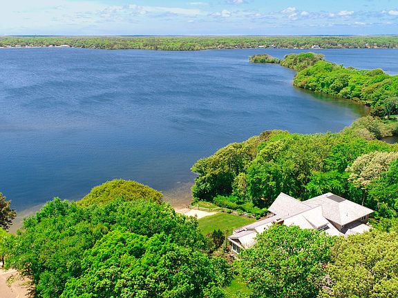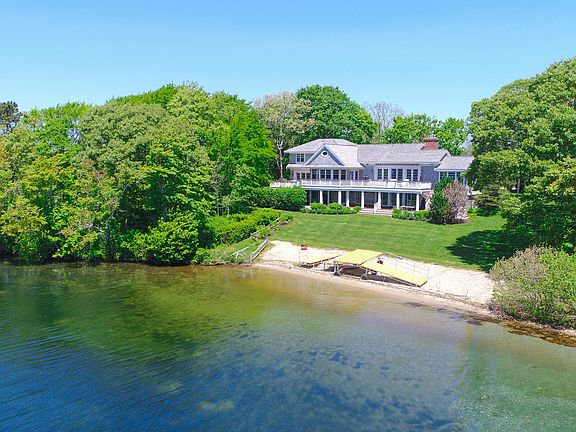 Stunning contemporary waterfront on Lake Wequaquet offering approximately 770 feet of frontage with it's own private beach and dock! This property is located on a peninsula jutting out between Lake Wequaquet and Bearse's Pond which gives gorgeous panoramic views. Gourmet kitchen with center-island, granite countertops, custom wood cabinets and breakfast nook overlooking lake. Family room includes beamed cathedral wood ceiling with spectacular stone fireplace and 3 sets of French doors leading to wraparound deck. First floor master suite with private views of Bearse's Pond and master bath. Beautiful private sandy beach, 5 bedrooms, 4 1/2 baths, partially finished basement with wet bar, fireplace, laundry, office, bedroom and walkout to your own private resort like grounds.