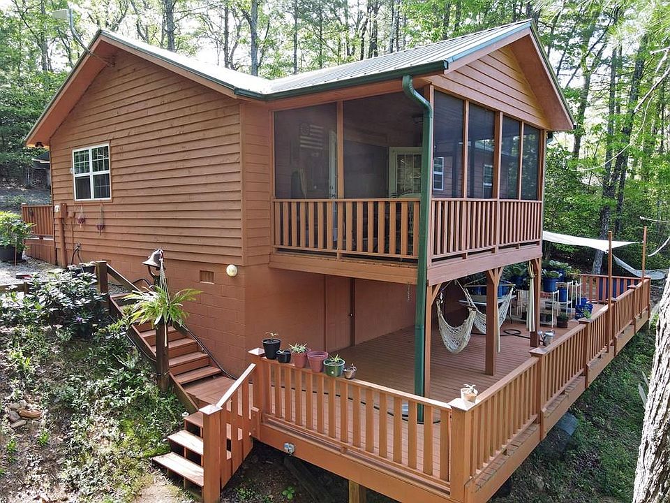 Wooded Gem in the Mountains!!! Fiber internet coming soon! Don't miss out on this 2 bedroom 2 bath cabin tucked away in this peaceful wooded community. Very open floor plan, along with porch brings a wonderful indoor/outdoor open feel to your home. Vaulted wood ceiling are a charming touch that creates a warm accent, along with a cozy gas fireplace in the living area. Beautiful custom island in the kitchen that adds a great surface/prep area, storage space and seating! Plenty of decking and outdoor space including screened in balcony with calming and tranquil wooded views, lower decking with hammocks seats to relax, as well as fire pit area for family and friends to gather around and enjoy! This is a perfect mountain retreat you can call home! Easy access and convenient location!