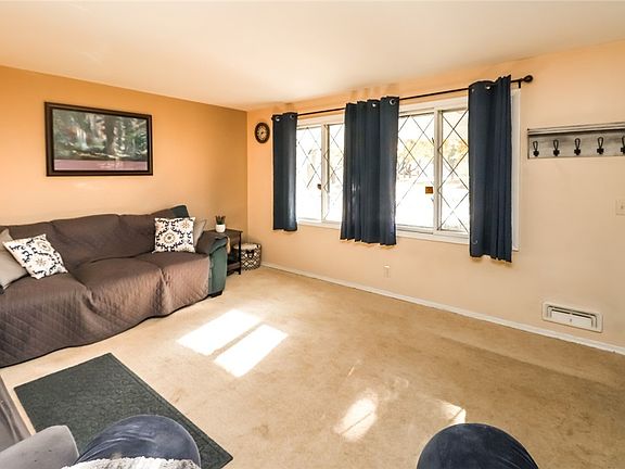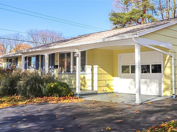 Downsizing or want one level? Come see this three bedroom, well cared for ranch nestled on a tree lined street . It's just under 1200 SqFt. The charming front porch entry welcomes you into the large living room & country kitchen w/ a cozy dinette area and more than ample kitchen cabinets. Enjoy your dinner by the sliding glass doors which overlook the scenic back yard. All kitchen appliances included! The newer range and dishwasher are great time savers. The updated bath has a modern vanity, Corian countertop, ceramic floor and adjustable/programmable multi-color ceiling light & fan, a "Serenity plus feature", Central Air, hardwood floors, full dry basement w/cedar closet "Brand New" roof and one car garage. Walking distance to bus stop, Shopping, Xway & restaurants! Ten minutes to Lake Ontario. You won't be disappointed.