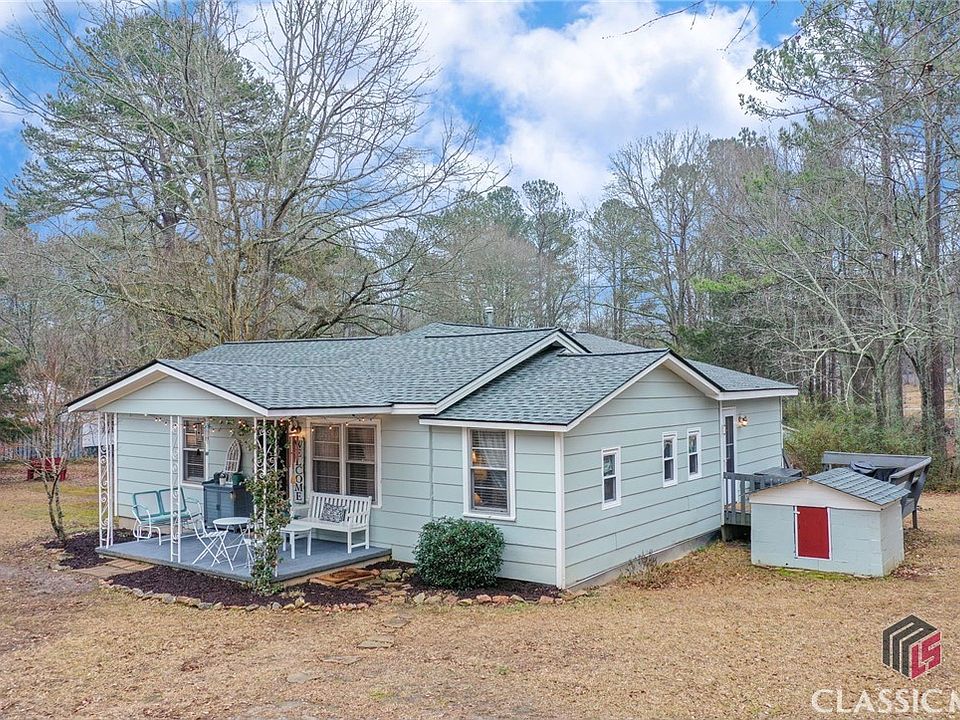 Cute craftsman farmhouse in OCONEE County with 4 bedrooms & 2 baths. Take the stepping stones to this quaint rocking chair front porch and sit a spell. This updated home was lovingly renovated in 2017 with all hardwood floors refinished, water heater, new roof in 2023, new windows added, new plumbing, interior painting, exterior painting, LVP flooring & updated plumbing fixtures, new HVAC 2023 & professional foundation work done. This great home has a large lot with a fenced backyard, large storage shed & mature hardwoods. Cute side deck for morning coffee. Bogart is a cute little town with a great library & walking park with playgound. Close to 316 for access to Atlanta plus close to Bear Creek Reservoir for great fishing or a picnic. Close to Statham with all the cute restaurants & antique shops but also not far from Athens. The beautiful hardwood floors, renovated kitchen with stainless appliances, backspash & cute decor this is a one of a kind rare find in Oconee. There is a family room plus a homeschool or bonus or office along with 4 bedrooms. If you are looking for affordable in Oconee then this is the one! OPEN HOUSE SUNDAY 1/28/24 from 2 - 4 pm. No night showings and pets on premises. Make an appointment today!