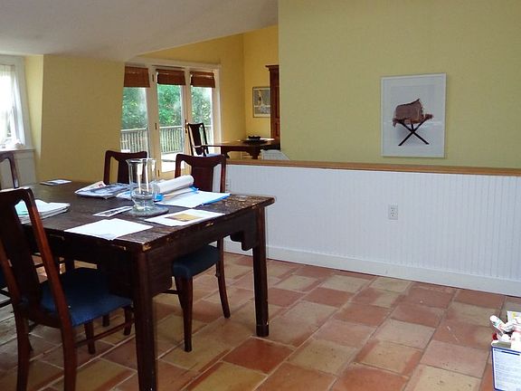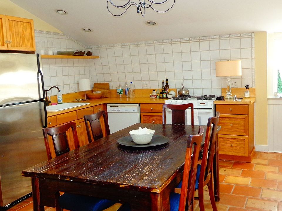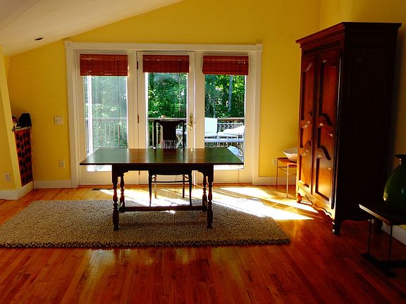 Unique and charming 3 Bedroom/2 Bath apartment located within larger gambrel style house. Features include 2 large wood decks, ceiling fans, cathedral ceilings, fireplace, hardwood floors, skylights, large entry foyer, laundry room, study/office/guest room, living room and large eat-in kitchen and dining area. Antique doors installed throughout give it a charming warmth. The apartment has 4 exposures, french doors lead out to large decks, 2 Large walk-in closets & linen closet. Two full bathrooms, jacuzzi tub and separate shower. Living room features a raised fireplace. Open Eat-In Kitchen with paver floor, handmade tiled backsplash, skylight, dishwasher, gas-stove. The spacious apartment contains approximately 1,800 Square Feet. The house is approximately 15 years Old. There is no pool on the property.