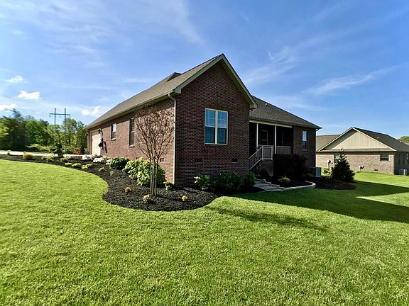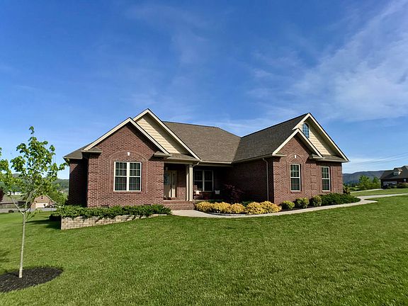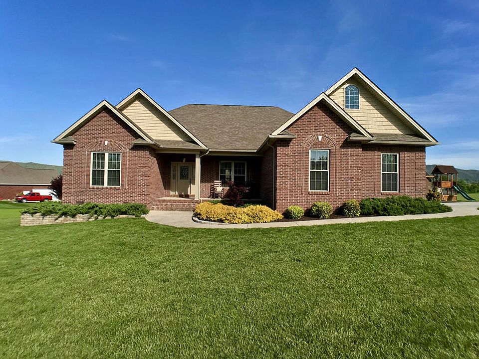 ''Imagine coming home to this beautiful, full brick home everyday! This well-appointed one-owner home boasts a spacious, open floor plan; tall ceilings; gorgeous custom moldings; stunning mountain views; hand-scraped hardwood floors; and a modern kitchen with L-shaped island, high-end solid surface counters, ample cabinet space, stainless appliances, and tiered bar. The breakfast area and formal dining room each extend from the kitchen and the adjoining living room with its inviting gas fireplace. This one level home has a split bedroom floor plan with a large master suite on one side of the home and the other three bedrooms on the opposite. The luxurious master suite, with its ample recessed lighting in the trey ceiling, spacious walk-in closet with custom closet organization system,