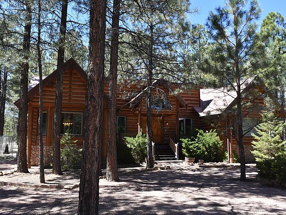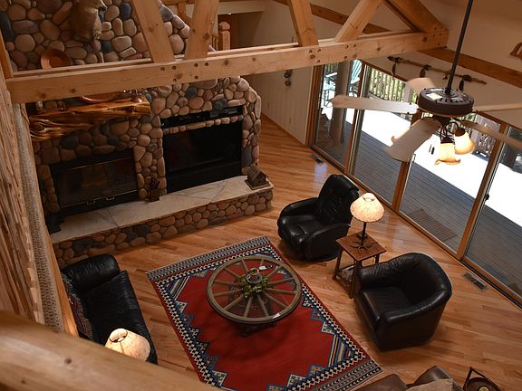 When you think about what makes -The Perfect Cabin- perfect you might think about a great room with dramatic ceilings and a fireplace with a log mantle and a floor to ceiling stone hearth. A big window wall to bring the surrounding Ponderosa Pine Forest indoors is a must! You might imagine a big kitchen with a center island cook-top/griddle, double ovens and big breakfast bar. There's A Big Eatin' room - the place you'll gather. A large loft with a game table overlooks the great room. Log posts and beams,exposed wood trusses, crafted woodwork and luxurious wood clad windows adorn the entire cabin. All guest bedrooms are suites, each with their own bathroom and sitting area with a futon that can be another bed. All bedrooms are separate from each other to maximize privacy for all guests and their families. A private grand master bedroom suite complete with a snail shower, a roman tub for two and a big vanity with hers & his sinks for the royalty of your lair! Outside you may need a covered porch where you'll sit to unwind to the sweet aroma of the towering pines or to watch a rainstorm or a grazing doe. A big deck overlooking the forest with room for an outdoor living space and a BBQ Grill. It's a natural hand peeled log exterior with chinking and it's nestled in a most amazing stand of giant trees at the end of a quiet road. All of that would be a big bonus but only if it was available at an affordable price! Does any of that ring a bell? Now, there's a rare opportunity to own this amazing dream cabin for a fraction of replacement cost. It is in excellent condition and ready for your immediate photo album!