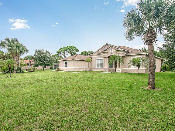 Looking for space? Plenty of room in this 5 bedroom 3 bath 3 car garage on an acre of land. Generously proportioned living and dining area with large 5th bedroom that could be used as multi purpose room with double doors off living/dining area. Master suite has access to covered patio, two closets, tub with separate shower, dual vanities and water closet. Kitchen open to nice sized family room and breakfast nook with large picture windows overlooking backyard. Once bedroom and bath the the rearof the home, perfect for guest suite. Inside laundry room. HVAC system and water heater two years old, new water treatment system. Minutes to Habitat Golf Course, US1 Senic Highway and the beautiful Indian River. Call today!