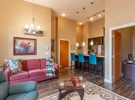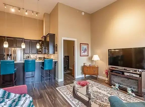 This 1 bedroom, plus a den, 1 bath unit features 748sqft of living space plus a 220sqft solarium, 16 to 18 foot vaulted ceilings in the great room, Air Conditioning in the great room and master bedroom! One year old building by Quadra Homes has all the bells and whistles with granite counters, natural gas cook top, beautiful cabinets and flooring