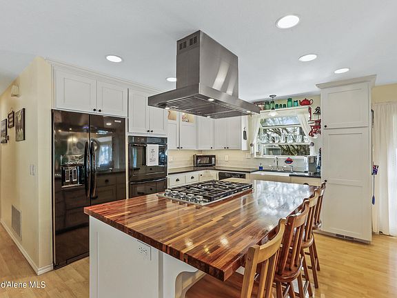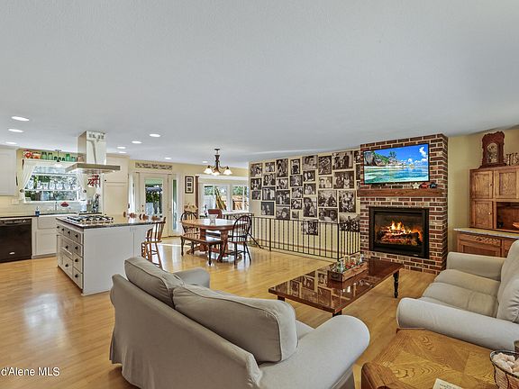 This well-maintained home features a bright, open floor plan, laminate flooring, 3 fireplaces, a home theater, bar and storage galore. Less than half a mile to the CDA Golf course and minutes away from shopping and medical services. The kitchen is a chef's dream with a custom, expansive island including a gas cooktop and large hood vent. The island also allows for bar seating. The white, custom cabinets with soft close are galore. The charming and exquisite farm sink has a garden window right above it to view the peaceful backyard. Double convection ovens will allow you to bake for large gatherings. The main floor laundry is large and has a counter for folding and lots of storage. The long window seat by the backdoor is perfect for reading or relaxing. Main level primary suite has a jetted tub and double closet. The high efficiency gas furnace is only 4 years and has a nest thermostat. The gas hot water tank is also new. The basement has 2 new direct vent electric fireplaces and waterproof flooring throughout. The downstairs bedroom is non-egress and has a half bathroom. There is a large bonus room that has so many options! Gutters and roof are about 10 years old. The backyard has a deck with pergola, raised garden beds, greenhouse, blackberry bushes and an herb garden. Double gate on the side allows for parking a boat or RV easily. Home has a radon mitigation system.