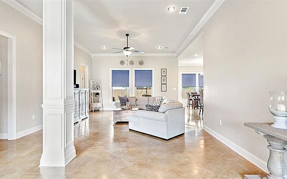 Beautiful move in ready home in Gated Bedico Trace Subdivision seconds from the parish line. Large open airy floorplan with crown molding. 4 bedrooms, 2 baths with 11ft ceilings throughout and NO CARPET! Step down ceiling in large owners suite. Gorgeous kitchen - White cabinets and stainless appliances. Granite in Kitchen and Baths. Nice fenced yard including separate dog yard and extended patio. Community Playground with Pavillion. Flood Zone X.