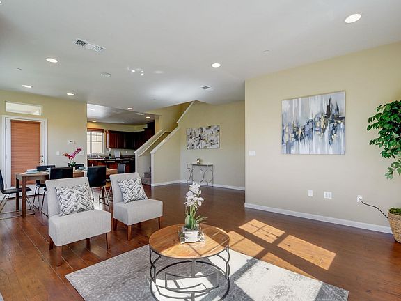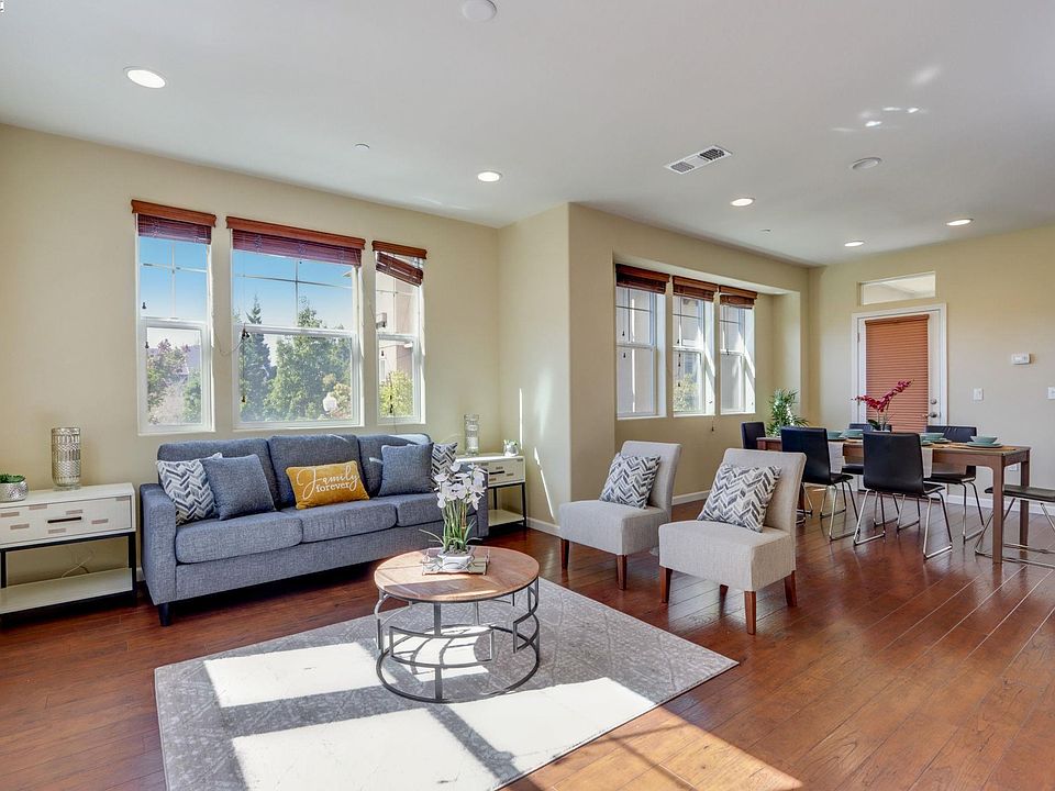 Stunning Contemporary single family home features a bedroom and full bathroom on the ground floor. Home features granite countertops, Cherry cabinets with pull out drawers, stainless steel appliances in the kitchen. Soaring high ceilings on the main floor with wood flooring, recessed lights. and a private balcony. An abundance of natural light! Attached two car garage with an EV charger. This home is situated in the best location of this community, steps away from the community barbecue/picnic area and trail path. Close access to Lake Elizabeth, Fremont main library, BART, 680 & 880 freeways and shopping. MUST SEE!