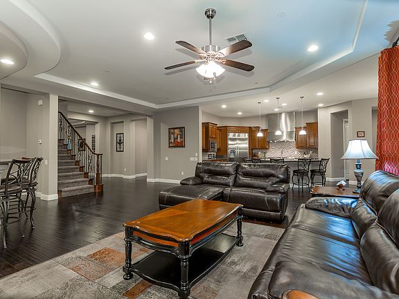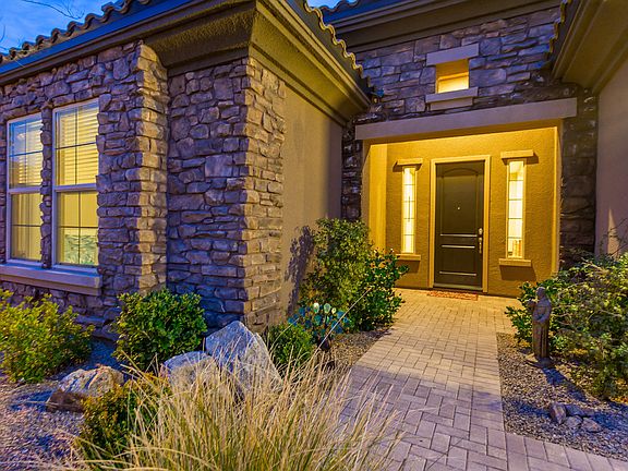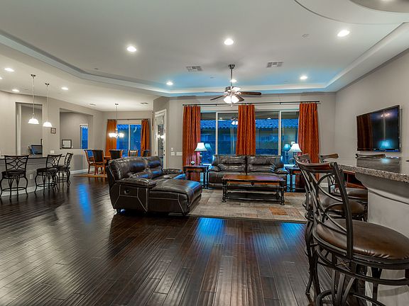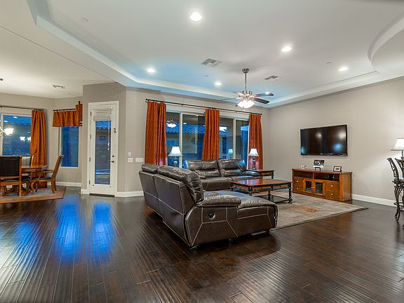 Stunning guard gated single story "like" corner home with Strip & Mtn Views, sparkling pebble tech pool & spa, firepit, lush landscaping, great-room with wet bar & wine fridge, gourmet kitchen w/commercial grade stainless steel appliances and huge walk-in pantry, hardwood floors throughout, plantation shutters & ceiling fans. *Upstairs you'll find the 2nd Master Bed or media room with balcony that enjoys amazing views of the Strip & mountains.