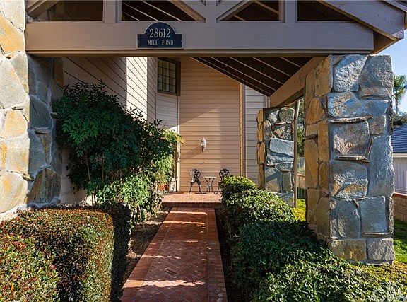 Just within the gates of the prestigious lake view community of Canyon Crest down a quiet cul-de-sac street of only 16 homes sits 28612 Mill Pond. This gorgeous Stoneybrook model boasts numerous upgrades and sits elevated from the street giving it amazing curb appeal as you look up and see stone covered walls, a newer tile roof, patterned brick walkways and an impressive wood covered portico. Step through the custom glass ornate front door into the formal entry with recently refinished wood floors and soak in the abundant light from the many windows, skylights and soaring cathedral ceilings that fill this well appointed home. Chef?s dream kitchen complete with emerald pearl granite countertops, wood cabinets and stainless steel appliances. Gorgeous master suite with sitting room, double sided fireplace, balcony with backyard and sunset views, and a large walk-in closet. The master bathroom is a 10+ with dual sinks, travertine floors, garden tub, and a polished natural stone covered seamless glass shower. Oversized secondary bedrooms with vaulted ceilings and mirrored closet doors. 5th bedroom could easily be a bonus room. Interior of the home was recently painted and brand new neutral colored carpeting was installed. The backyard is a peaceful and private paradise with mature trees, tropical flowers, plenty of grass, hardscape, and a large built in BBQ island. Walk to beautiful Lake Mission Viejo or enjoy the many association amenities this guard gated community has to offer.