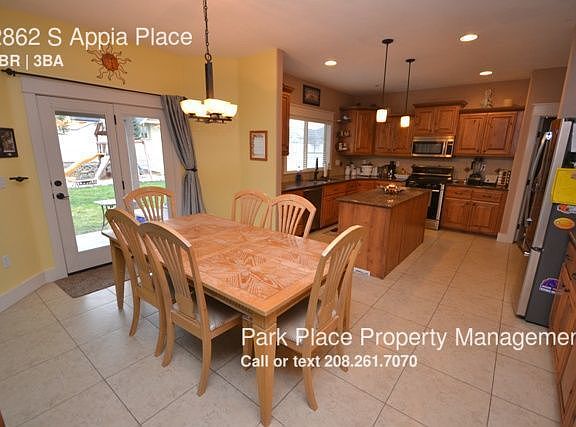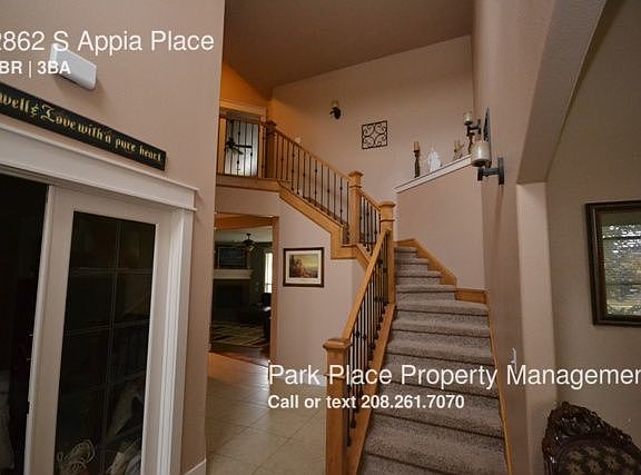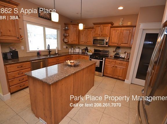 SCHEDULE A SHOWING ONLINE AT: showmojo.com/lh/451b8ba0d2 This spectacular home is located off of Victory and Meridian Rd. This beatiful home is loaded with with upgraded features and amenties including a 3+ car garage. This could be just what your looking for! You'll walk in to the grand foyer with vaulted ceilings looking on to the curved staircase. To the right is the living room with vaulted ceilings and large windows allowing plenty of natural light. Just off the living room is the formal dining room. There is also an office/den just off the entry. The kitchen is a chefs paradise with stainless steel appliances, granite countertops and abundance of counter/storage space. Not to mention the large walk-in pantry and kitchen island. The open floor plan between the kitchen, dining and family room make it perfect for entertaining guests. The family room features hardwood floors, fireplace and ceiling fan. Rounding out the first level you will also find a full bath and the first of 5 bed rooms. On the 2nd level you will find the other 4 bedrooms all a great size with ample closet space lots of natural light. The spacious master features vaulted ceilings, ceiling fan and walk-in closet. You will love the master bath with dual vanities, soaker tub and large walk-in shower with dual shower heads and tile surround. The covered patio and fenced yard are just waiting for you to enjoy. To fill out an application please visit: www.parkplaceid.com or To set up a showing please call 208-261-7070 Security Deposit: 2000 Parking: 3 + Car Garage Lease Length: 12 month Subdivision: Strata Bellisima Nearest Cross Street: Meridian Rd and Victory Square Footage: 3700 Virtual Tour: N/A Date Property Available for Viewing: 2017/3/10 House Number: 2862 Bathroom: 3 Bedrooms: 5 Pets: Yes (additional deposit may be required) Utilities Included: None Price Specials: none Balcony Deck Or Patio Disposal Filter Easy Program Formal Dinning Room Gas Fireplace Granite Countertop Hardwood Floor High Vaulted Ceiling Kitchen Exhaust Fan Meridian Office Den Walk In Shower