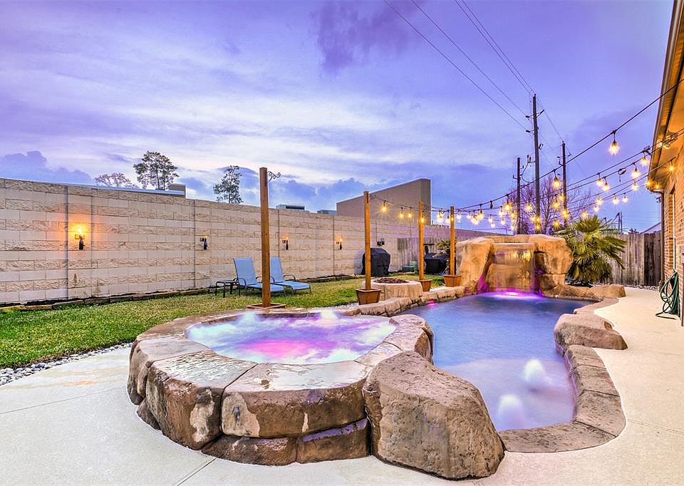 This beautiful 5 bedroom home features a hard to find layout with the MASTER and TWO SECONDARY bedrooms downstairs, TWO spacious secondary bedrooms is upstairs along with a tiered seating MEDIA room and a great GAME room. Open concept living at its best from front to back you can see the formal dining room, great living room, kitchen with an island a breakfast bar and a spacious eat in breakfast area. You have a TEN foot ceiling and windows all round for that spacious, airy, light, and bright feel. Looking for a backyard paradise? We got a custom SALT water pool, with a bubbling SPA, a WATERFALL that you can go behind, and a SPLASH PAD/TANNING LEDGE, a firepit, and kerosene lamps that lit up the back stone wall. A covered patio is waiting for your patio furniture, outdoor grill, and TV you can mount to complete your outdoor entertainment area. Did we mention a dog run on the side? Media room projector, screen, and furniture stay!