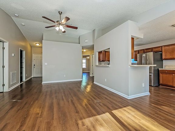 Please note, our homes are available on a first-come, first-serve basis and are not reserved until the lease is signed by all applicants and security deposits are collected. This home features Progress Smart Home - Progress Residential's smart home app, which allows you to control the home securely from any of your devices. Want to tour on your own? Click the "Self Tour" button on this home's RentProgress. This three-bedroom rental home in Jacksonville, FL features central air and an attached garage. You'll enjoy stylish laminate flooring in the living room. Ceiling-height wall niches give the room a very upscale appearance. The glass door reveals a large back patio. In the kitchen, there's a small breakfast bar, and you'll love dining under the elegant chandelier in the breakfast nook. The nearby bay window floods the space with natural light and warmth. Enjoy having both a walk-in closet and a private en suite bathroom with dual vanity sinks in the main bedroom.