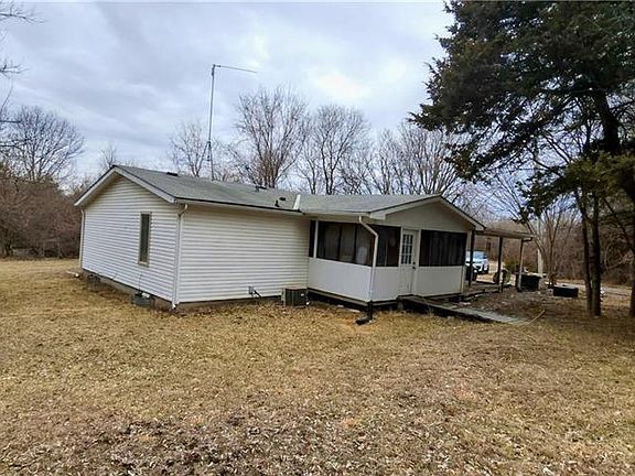 Home on 4.5 acres! Looking for a fixer upper to make your own? This home is in Paola on 4.51 acres being sold AS IS and has loads of potential. Has all new flooring and carpet. Front of home has a covered deck that walks into an enclosed cedar patio with main entry door into the home. Walk into large living room with master bed and bath to the left. To the right is hallway, bedroom 2 and 3 and 2nd full bath. All three bedrooms have large walk in closets. Off the living room is Kitchen and dining room with a walkout to another enclosed patio. Off the kitchen is laundry room that has door to walk into the master bath and a door outside to the back of the home and lot. Alot of cleared land on the property. East side where the woods start there is a pond at the top of the hill. It has dried up alot over time but with some TLC can be filled and stocked for a nice little fishing hole of your own! I picture a gazebo up there and all! Has a large detached garage. 1 stall but can fit 2 cars. Entry into the property has a LARGE all Metal structure that isn't too appealing to the eye, but is all metal and was used as a workshop. Some TLC and cleanup outside and you have an amazing little retreat of your own. Front of the house faces west instead of to the street for even more privacy and seclusion to enjoy the covered deck and enclosed patio spanning the whole front of the home with no neighbors. Property Goes all the way to 287th. Home and land priced accordingly to account for any repairs.