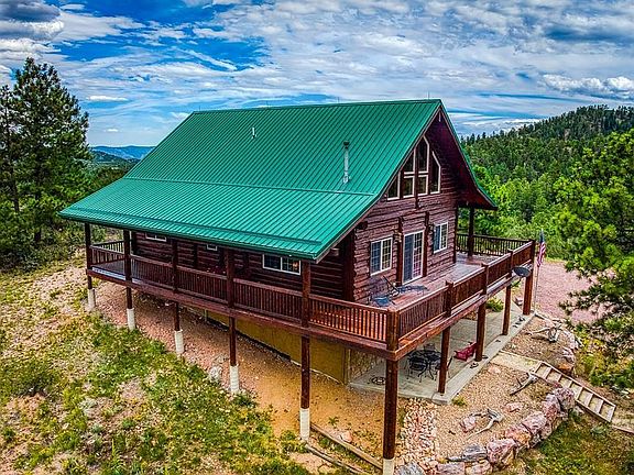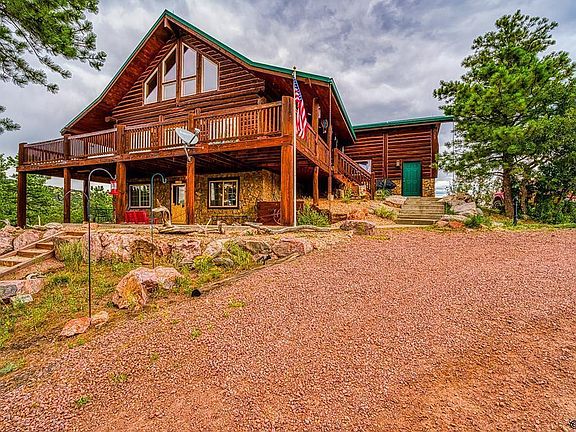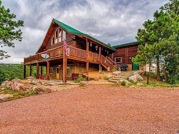 NEW LOW PRICE!! SELLER IS MOTIVATED, WILL CONSIDER OFFERS on this Custom full log home set upon beautiful forested 35 acre lot that offers breathtaking mountain views in all directions. Exceptional rustic log interior awaits as you enter the main level large open living room with towering ceilings with custom log beams and expanded windows, newly installed efficient pellet stove fireplace offers exceptional heating, stylish open kitchen with quality cabinetry & large island sitting bar, large master bedroom suite with full bath and double closet. Large second story loft includes a open sitting/work area perfect for a home office, private guest bedroom and full bathroom. In the lower walkout basement you with find a expanded family room perfect for entertaining along with a unique 4 bed "sleep over" kids cabin that any kid would love. Features continue with a full wrap around mainlevel wood deck and a lower walkout level wrap around concrete paito to provide exceptional outside places to enjoy the beauty that surrounds the great home. Oversized 2 car garage with storage loft plus a detached 18 x 30 finished sgarage/workshop with woodstove and exterior patio area! Abundant wildlife with almost daily visits from wild turkey & deer. Wonderful, private mountain living located in a gated subdivision with access for hunting, hiking and other outdoor activities. Located only 30 minutes from Canon City. Time to make the mountain living life a reality with this fantastic home!