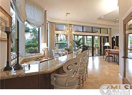 This stunning custom Mediterranean home was quality built in 2007. Located in a gated community of 12 homes on a quiet cul-de-sac, this 4 bedroom, 5 full bath, 3 half bath, 3 car garage home is filled with elegant touches. There is crown molding, marble floors, whole house surround sound, 5 zoned a/c's and impact windows and doors throughout. Enjoy 191 feet of water frontage and dock with lift for a 20 foot boat. There is water access and a fixed bridge. Circular paver drive with decorative insert, mature tropical landscaping and custom lighting make a welcoming statement as you arrive. Step through the 6 panel double doors into the dramatic 2 story foyer with arched windows and chandelier. The living room boasts 24 foot coffered ceilings, crystal drop chandelier, floor to ceiling windows
