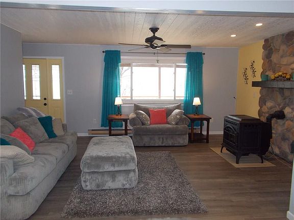 This stick-built ranch has so much to offer! Vinyl windows, new flooring, fresh paint, new wiring in garage, and marble windowsills inside. Stocked pond with bass, bluegill, and sunfish. 6+ acres of trails perfect for hunting. Large open concept living/dining/kitchen with modern flooring and cozy pellet stove. 3 bedrooms, all with good sized closets and spacious full bath. Laundry/mud room with half bath off of large family room. Breezeway connects to attached 2 car garage. Large shed perfect for storing yard tools, ATVs or extra vehicles. Enjoy beautiful sunsets from recently painted front deck overlooking large pond and mountain views. Close to Hornell, Andover, and Alfred.