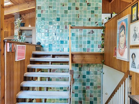 the various levels of the home and extends up into the gorgeous green tile fireplace. Privacy is easily