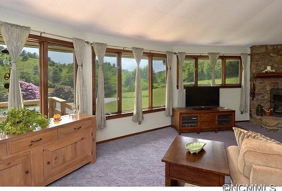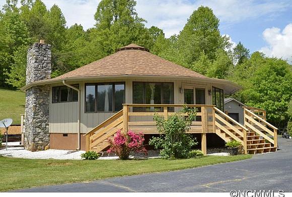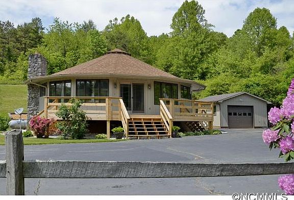 Light filled Deltec round home with cathedral ceilings. Great for vacation home or year round living. New roof, new exterior paint, 3 sets of new glass doors, updated bathroom, HVAC only 4 yrs old, reclaimed barn wood focal wall and stone fireplace. Enjoy 1.75 acres of level to rolling grassy yard with pear, Bing cherry and plum trees. Plenty of parking for guests, circular drive & 1 car garage. Easy drive to Asheville, Weaverville & Mars Hill.