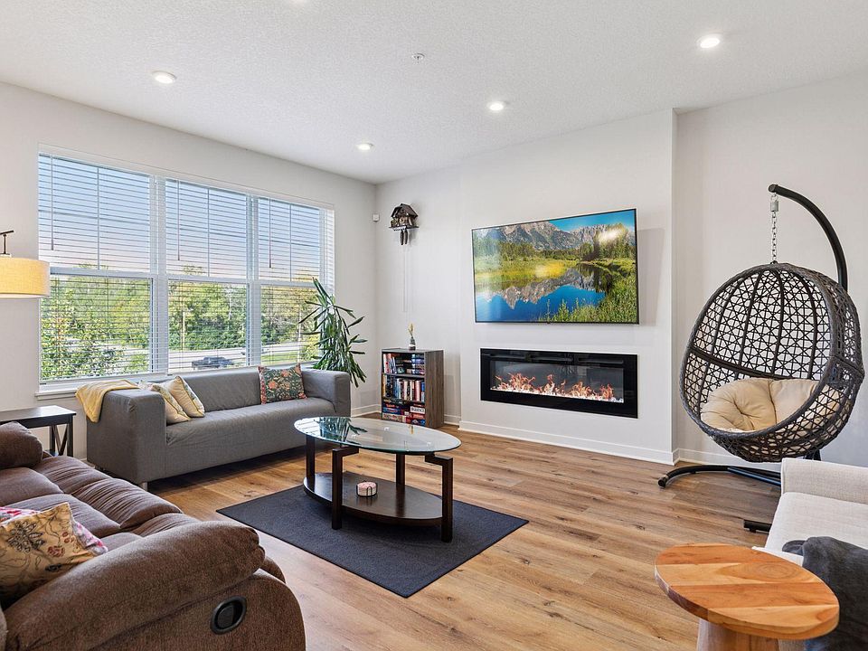 Electric fireplaceLarge center islandPlenty of natural lightingKitchen boasts oyster cabinetsStainless steel appliancesQuartz countertopsPrivate bathroom