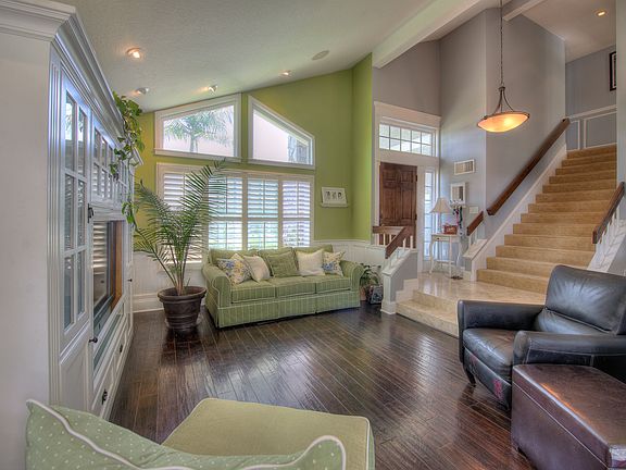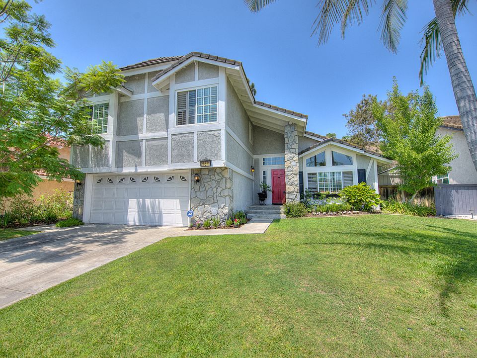 This CHARMING Tudor Style Home will satisfy the buyers wanting to relax outdoors while enjoying ocean breezes and starry nights. The features are numerous starting with a large backyard (lot 13,500' backs to greenbelt) several fruit trees; avacado, apple, pear, apricot, fig and lemon. Patio cover, kids playground set, Jacuzzi, great for entertaining. Upgraded kitchen with granite counters, nook and formal dinning room. Travertine floor! Cozy family room with newly custom built Slate Stone Fireplace, custom cabinets and mantel. Separate laundry room lower level. Window's are upgraded with duel-pane. Four bedrooms are upstairs with a master suite over looking the natural greenbelt for privacy, walk-in closet. Large attic storage and closet organizer. The 2 car garage has plenty of storage with coated flooring. The landscape is green and mature front and back. Low HOA and property tax rate. No Mello Roos!. MINUTES to hiking trails, parks, award winning schools, harbor and beaches! This is a must see and purchase. It wont last long so hurry.