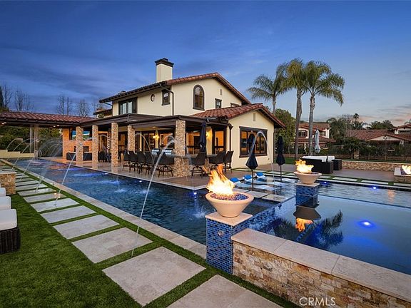 Nestled in the hillside of San Juan Capistrano, this one of a kind, extravagant estate located in the tranquil gated community of San Juan Estates, is an entertainer's dream! As you arrive at this beautiful 3810 sq ft. home, located on a 36,000 sq ft lot at the end of a cul de sac, you are welcomed through the private, gated courtyard to the gorgeous glass double door entry. Here, in the foyer, the bright light spills in where the high cathedral ceilings allow for ample light. As you make your way through the downstairs you will find a secluded office, private guest room with walk in closet and custom bath. The stunning chef's kitchen includes custom high end Italian cabinetry, Brazilian quartz countertops, a wine refrigerator, Wolf appliances with a SubZero refrigerator that opens to the expansive family room and dining area. Adjacent to the kitchen is the formal living area with a handsome fireplace, high ceilings and dramatic chandelier. As you traverse upstairs, you will discover the oversized loft with ample room for family living. The stately master suite is sure to spoil you with heated bathroom floors, a luxurious soaking tub, bidet, large shower, an abundance of windows with gorgeous views, a double fireplace and a walk-in closet with custom built in cabinets. As you peruse outdoors you will discover an impressive display of water features designed for pleasure and beauty. The automatic overflow lap pool with waterfall and water shoot is adjacent to the outdoor room that includes fireplace, fire pits, tv’s, outdoor kitchen with two built in barbeques and ample bar seating. The tanning pool, spa, and fire pits create a vacation-like tropical setting. With fruit trees, rose bushes and a large grassy area, this expansive space is sure to provide a majestic outdoor oasis. This immaculate property also includes built in cabinets in all closets, custom automatic shutters, marble flooring throughout, new carpet, security cameras wired to solar panels, paid solar system, self cleaning filter in house, tankless water heater, new A/C units, three car garage with custom doors, built in cabinets and epoxy floors. This spectacular home is ready for new owners. Welcome home to this beauty!