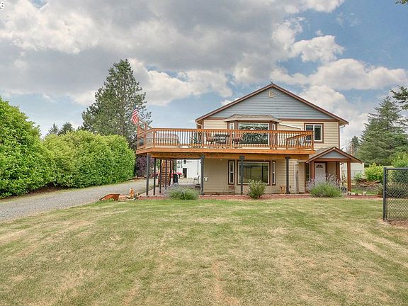 Beautiful 2006 custom 2596 sqft home on 5.52 acres, closer to Eagle Creek but Estacada address. 3 Very spacious bedrooms, 2 ½ baths. Master suite with 2 WI-closets, bay window, bath, and fireplace. Awsome Mt.Hood view from the bay window opens to a huge wrap around deck with a hot tub. Huge living room with a bay window & fireplace. Lower level has NEW gleaming oak hardwood floors. New carpet throughout 2nd story coming next week. Gourmet kitchen with granite counters, tile, pantry. All new vinyl windows except 2 big picture windows. Hardi plank electric furnace & heat pump, 2 car garage. 20 x 40 Shop, covered RV parking with power, 3 stall barn, fenced, gated, and private on a dead end street.