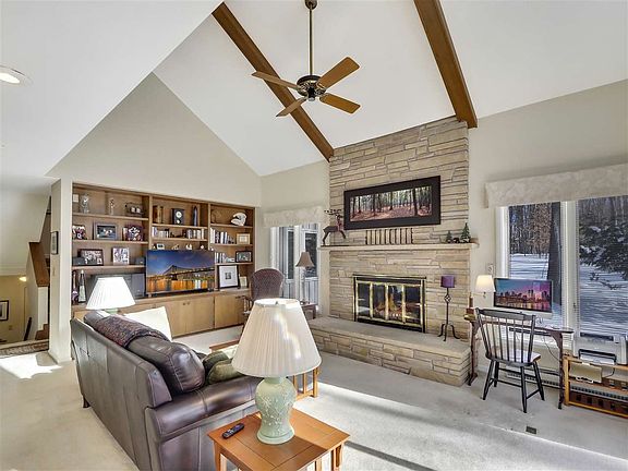 This charming & cozy 3BR / 2BA Birchwood home has a bright kitchen which opens to the dining area. The spacious living area has a lovely stone gas fireplace, a wall of built-ins, and cathedral ceilings with wooden beams. Just off the living room is a large deck, recently redone with low maintenance Azek decking, perfect for entertaining and to enjoy the great outdoors. The front porch has also had the decking replaced with Azek. The main floor master & laundry is convenient for single floor living with 2 guest rooms sharing a bath upstairs. The full basement is just waiting to be finished and makes for great extra storage. This home with the Birchwood amenities is fitting for vacationers and seasonal living but also accommodates year-round residents well with easy access to the Middle Road entrance and a lively community. A gas forced air furnace was added about 5 years ago which heats the main floor and rises through the loft to heat the 2nd floor as well. The original electric baseboard heaters are also in place for supplemental heat to each individual room. A one time initiation fee of $10,000 and monthly dues of $424 grant you full benefits of Birchwood's 27 holes of pristine golf, tennis, pickle ball, bocce, fitness center, heated swimming pools, nature trails and a vast array of activities and amenities.