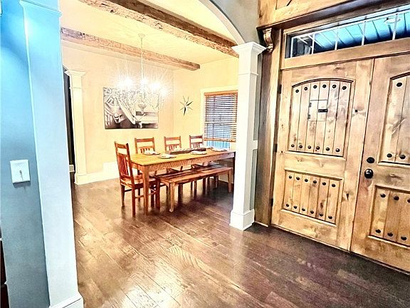 This house built by Perfection Homes has the perfect combination of rustic barn beams and crystal chandeliers.It has a beautiful lot on the pond that is near the community pool. It has been professionally landscaped to perfection with lighting for the perfect amount of privacy.The house has a roofed covered porch wrapping around the back that you can enjoy all year round. Has a large master with access to your back porch with master bath with granite and custom cabinetry