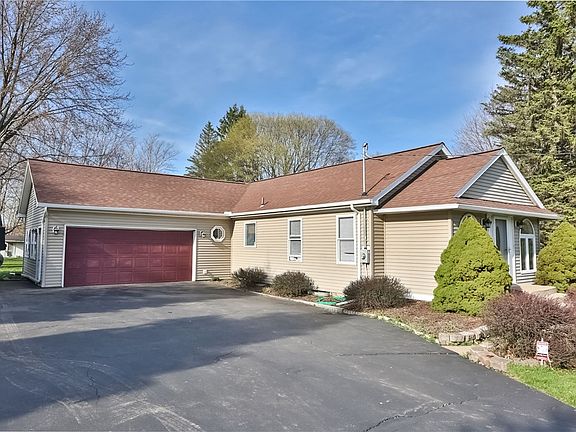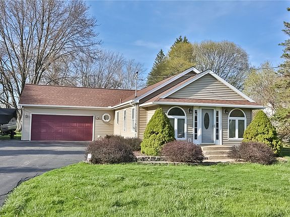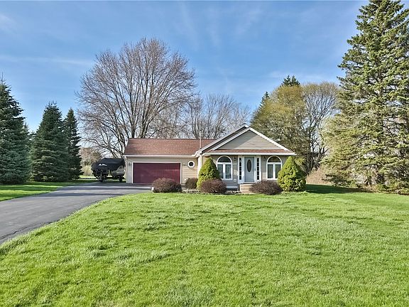 This charming ranch-style home boasts two cozy bedrooms and one full bath, situated on a serene property spanning just under an acre. Fresh paint throughout, creating a bright and welcoming atmosphere. In 2019, the home was tied to the public sewer system, offering added convenience. The tear-off roof was replaced in 2020, and a new hot water tank was installed in 2021. Vinyl thermal pane windows throughout. The kitchen is open and inviting, complete with included appliances. The living room boasts vaulted ceilings, a gas fireplace, and built-ins, creating a cozy and inviting space. The convenience of first-floor laundry adds to the home's functionality. Outside, a large outdoor patio overlooks the park-like yard, providing the perfect space for outdoor entertaining. Additionally, a large shed/shop with electric offers ample storage space. Located in the highly sought-after Spencerport school district, this home is a must-see. Delayed negotiations 4/25 at 6PM.