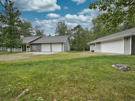 This one level custom-built home that has been lovingly maintained by its original owner, embodies quality and attention to detail at every turn. Nestled on over 2.5 wooded acres just minutes north of town, this property offers a serene retreat with the convenience of proximity to all amenities. From the moment you arrive, you'll be impressed by the expansive storage options available. The attached 24x36 garage is a standout feature, boasting in-floor heating, complete finishing, and an additional 13x8.5 storage closet, making it perfect for all your needs. You'll also find a large, convenient laundry area and a half bath just off the garage for added practicality. For those who need even more space, the detached 26x36 finished and heated garage with a workshop area will be a dream come true. Step outside to enjoy the 6x25 covered front porch with maintenance-free railing, or retreat to the 15x18 backyard patio that overlooks the private wooded acreage. The groomed trail and fenced garden area, complete with raspberry, blueberry, and asparagus plants, add to the charm of this residence. Inside, the 3-bedroom, 3-bathroom home is designed for comfortable living, featuring a primary suite with a walk-in closet and a spacious 3/4 bath with a large walk-in shower. This turn-key home with a compliant septic system is ready for you to move in and start creating your own memories.