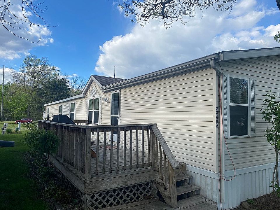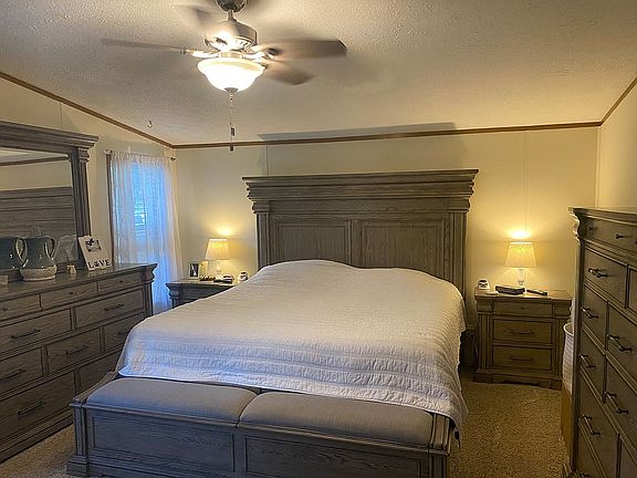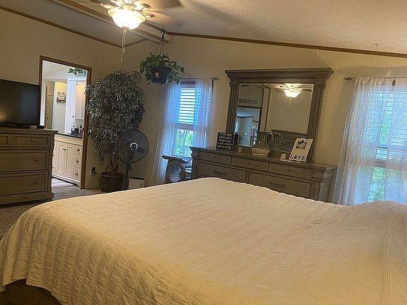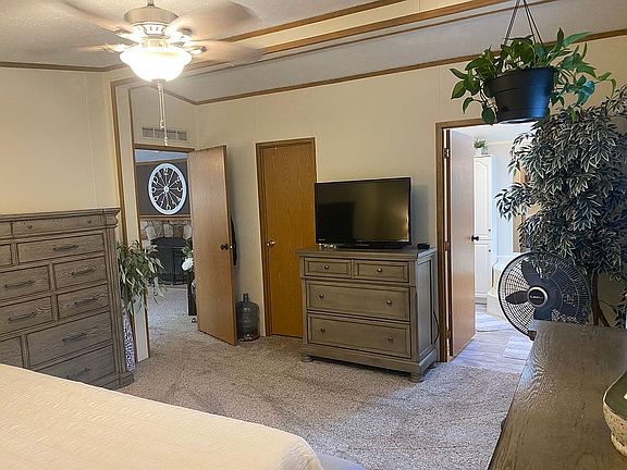 Beautifully maintained 4 spacious bedroom, 2 bath manufactured home. Need more space? This home offers a built in desk, eat in kitchen and flex space (Dining Room or office). The living room has beautiful windows and a natural stone fireplace with a stone surround and mantle. The fireplace is the center of a large open living room with a 9ft vaulted ceiling and new energy efficient ceiling fan. The living room flows into the dining room and kitchen in the open concept floor plan. You will love the amount of cabinet and countertop space you have in the kitchen with the large island and walk in pantry. The kitchen flooring has been upgraded to feature luxury vinyl wood grain flooring. Skylights in the both bathrooms and kitchen open the areas up to a lot of natural light and give this home a light natural airy feeling. The master bedroom features a huge walk-in closet and it’s own private bath with an upgraded sink vanity, separate shower, and a large non-jetted garden tub. This home offers a split floor plan with the master suite on one end and the other three bedrooms and extra bath on the other. Stove/Oven, Fridge, Dishwasher included. Matching 8x8 shed included. Lot Rent is $545 per month. This home is located directly across the street from the community pool and sits on a beautiful corner lot by the entrance. Community approval required.