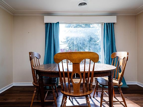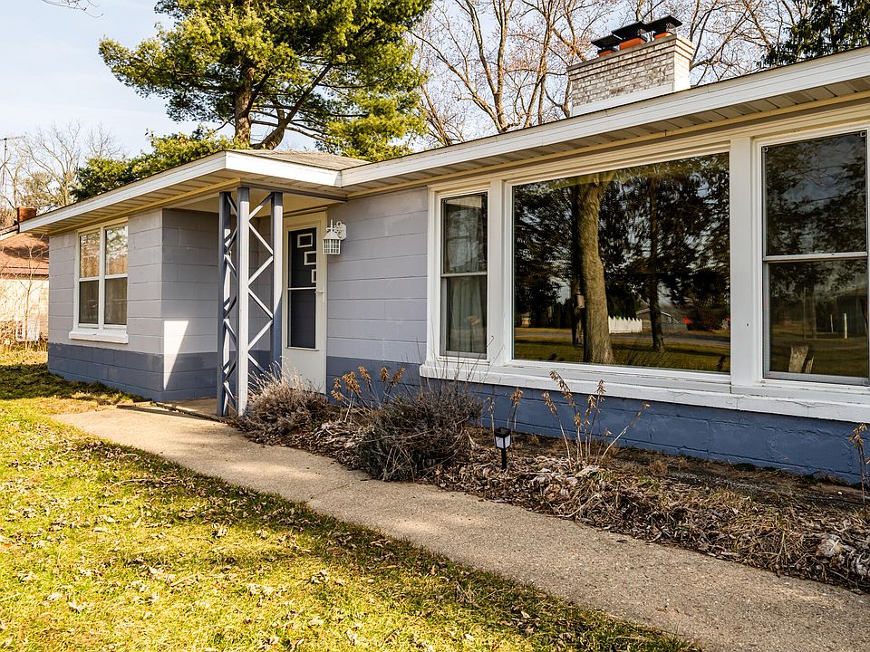 Classic Mid-century Modern ranch with 3 beds, 1 bath, two car garage, two story shed nestled on almost an acre. Solid block ranch on a slab with no step entrance, this is much BIGGER than it looks and perfect for those who want everything all on the main floor. There's a fieldstone fireplace with a wooden mantle in the living room/dining room along with two vast picture windows, letting in tons of natural light. The custom crown moulding and custom cornices concealing the curtain top elevates the room to new levels. The kitchen has its own eating area also, complete with classic crafted cabinets. There are 3 HUGE bedrooms that could comfortably fit king sized beds are ALL freshly carpeted. The natural gas furnace and AC were done in 2016. The two car garage and a concrete driveway make for great parking. The property is a proper rectangle that butts up to Wilson DR behind it. In the spring and summer, the green grows into a lush green thicket! Come and see soon!