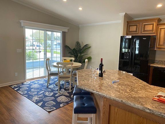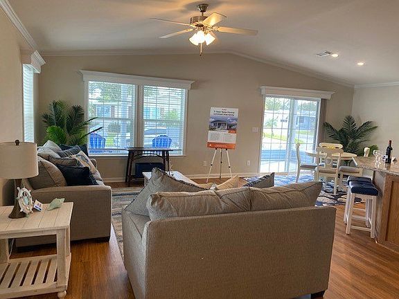 This gorgeous 2020 two bedroom home with a den/flex room and peninsula kitchen is an absolute MUST SEE! The home boasts a large master suite, separate laundry room, laminate flooring in common areas with carpet in the bedrooms, crown molding throughout and neutral color scheme. Did I mention the large screened in front porch, outdoor golf cart shed and covered parking this home offers? Occupy yourself with our community activities and live worry free with the 7 year limited warranty this home comes with. Located down the street from the pier and dock. Call today to schedule a tour.