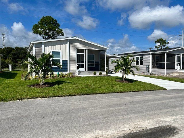 New Champion, 2 bed, 2 bath home with a spacious primary bedroom and den/flex room. LVT vinyl flooring throughout the home with carpet in bedrooms. All new stainless-steel appliances grace the open concept kitchen. A kitchen island/breakfast bar increased options for additional eating areas. Includes a screened porch in front. Offers a 7-year limited warranty so you can worry less and live more. Meet new neighbors and enjoy our active 55+ resort style living. Call today to schedule your tour of this home.