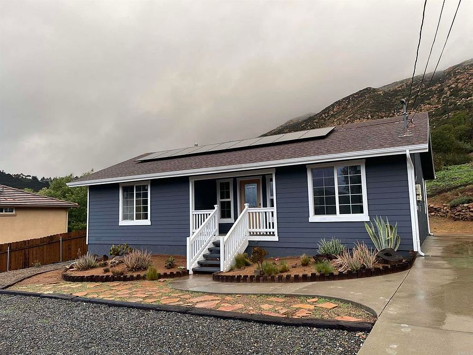 Tucked back in off Harbison Canyon you will find this lovely single family detached home that makes a bold statement with the blue. Simple lay out distributes the square footage mainly to shared living space. When you pass through the front door you are welcomed by an open living area with vaulted ceilings open to a renovated kitchen and dining room. The main areas have hard surface wood flooring and the bedrooms have been freshened up with new carpet. The kitchen has been updated with quartz counters, stainless steel appliances, and the cabinets are sporting a new coat of trendy neutral green paint. Upgraded fixtures and recessed lights can be found throughout. Stackable laundry closet can be found in the hall. Plenty of storage between the larger and smaller shed located in the back and side yard. Yard is a bank slate for you to bring your personal touch to finish it off. Whether you are on the front porch or the back yard, soak in the views of the mountains and wild sunsets. Nearby is Old Ironsides County Park, hiking, and a quick trip into Alpine or Sycuan.Come see for yourself before it's gone!