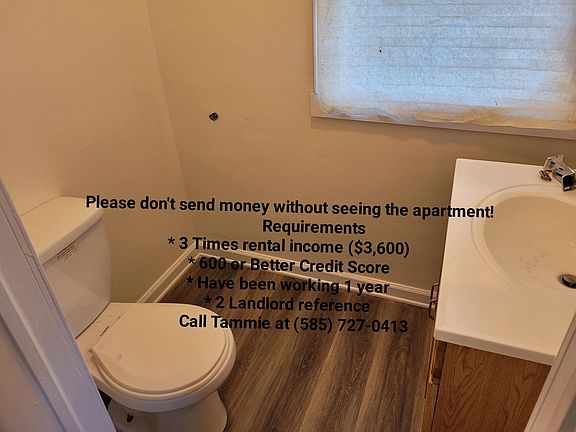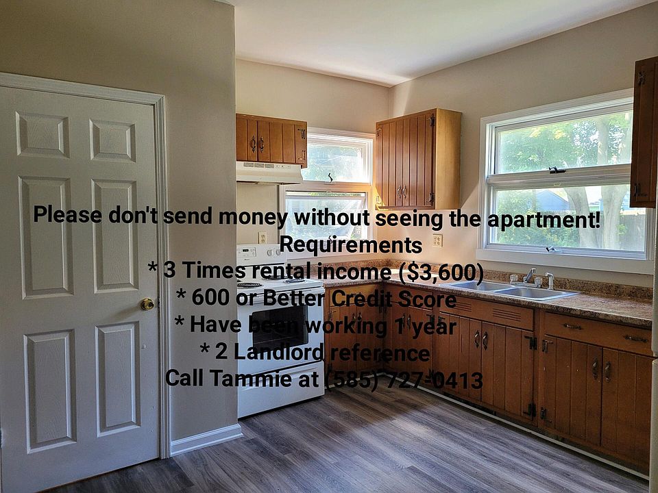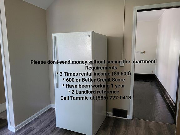 Freshly painted, 3 bedroom, half of a house, is available . This beautiful home has one and half bathrooms. Hardwood floors and Luxury vinyl floors throughout the home. Comes with a refrigerator and stove. No smoking and No Pets. Street parking is available . This is a must see! Requirements * 3 Times the rental income ($3,600) * 600 or better Credit Score * Have been working 1 year * 2 Landlord reference Owner pays water. Tenant pays RG&E. No smoking and no pets.